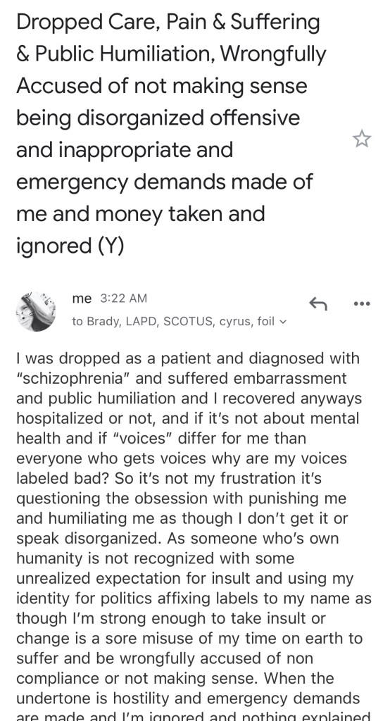 I was dropped as a patient and diagnosed with “schizophrenia” and suffered embarrassment and public humiliation and I recovered anyways hospitalized or not, and if it’s not about mental health and if “voices” differ for me than everyone who gets voices why are my voices labeled bad? So it’s not my frustration it’s questioning the obsession with punishing me and humiliating me as though I don’t get it or speak disorganized. As someone who’s own humanity is not recognized with some unrealized expectation for insult and using my identity for politics affixing labels to my name as though I’m strong enough to take insult or change is a sore misuse of my time on earth to suffer and be wrongfully accused of non compliance or not making sense.