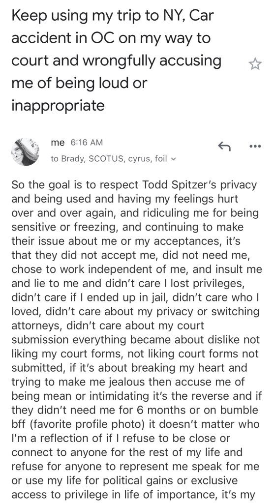 So the goal is to respect Todd Spitzer’s privacy and being used and having my feelings hurt over and over again, and ridiculing me for being sensitive or freezing, and continuing to make their issue about me or my acceptances, it’s that they did not accept me, did not need me, chose to work independent of me, and insult me and lie to me and didn’t care I lost privileges, didn’t care if I ended up in jail, didn’t care who I loved, didn’t care about my privacy or switching attorneys, didn’t care about my court submission everything became about dislike not liking my court forms, not liking court forms not submitted, if it’s about breaking my heart and trying to make me jealous then accuse me of being mean or intimidating it’s the reverse and if they didn’t need me for 6 months or on bumble bff (favorite profile photo) it doesn’t matter who I’m a reflection of if I refuse to be close or connect to anyone for the rest of my life and refuse for anyone to represent me speak for me or use my life for political gains or exclusive access to privilege in life of importance, it’s my life it’s not me treating anyone as unimportant or taking risk with anyone else’s guilts or issues, it’s about why bring up my reactions and upsets as though it has anything to do with DeNiro’s nephew passing bring up phone call from an attorney who insulted me scared me intimidated me worked closely with Todd Spitzer talks to the Attorney General and accuses me of being mean or unprofessional, therefore she can’t forgive me shouting “calling her a f-king slut” before hiring a new attorney, so stop wrongfully accusing me of having some unprovoked jealous reactions or in some place better of privileged to be interjected or some bubble to be poked like I can’t tell the difference between a positive day deserved from how a bad day is made and by who’s hurting me after politely requesting to not be contacted by them then it’s not my forgivesness not granted or their closeness …. Brought up to wrongfully accuse me of being mentally ill inappropriate or not moving on not talking to anyone is what I did and will do now since me writing to NY DA is about a phone call from Attorney Prizzia in NY over messaging Todd Spitzer and him letting me know that they talk that’s his comfort and their discussions has nothing to do with me or my reactions, I did my best in NY, if I’m not allowed to drink it’s in wellness or talkative permits others to attack me as irresponsible and bring up over and over again how I’m treated with “schizophenia” or why I get hurt easily, not ne appreciative if I had a life was social. I didn’t lose everything to alcohol I lost everything to this lawsuit including what others think of me. Let alone women who could care less and homophobic toward me and in constant dissatisfaction with how I look and sound and expecting a more harmonious personality off adderrall unable to read speak or run …. Again I’m not writing to the NY DA to chastise or condemn Todd Spitzer and his office constantly featuring other women they’re proud of and continue to criticize me as though I’m jealous as a top blogger with book dreams and in contact with exes loved and reached out to, but again what can’t be forgiven is why I’m hurt or insulted by it and I’m the future not care no matter how sensitive the issues are the truth is it’s my story and my case and my past 10 years and if I feel questioned I have every right to challenge a negative innuendo and not be punished for Todd Spitzer’s preferences and with reflection on my privacy and the purpose for changing me or not accepting me and making me sound weird and be rejected by men on some hierarchical basis of who’s a woman or who can take what wrongfully accuse me of being critical of any woman I didn’t have a problem with respected …. And think I handled myself well participating on a hashtag.