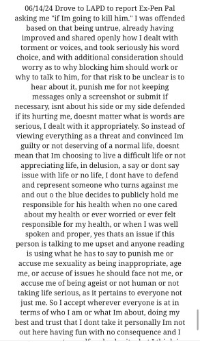 June 21, 2024 drove to the police station to report being mentally disturbed by him. He seems to continue to talk to me until I forget I’m an easy going person I’ve said I don’t get angry or upset easily I grew up being known for being “even tempered” “chill” high school. Therefore whatever is motivating him to hurt me isn’t his love for me but an experimented situation of what causes voices combining blogging what he says and accuse me of hearing other people which is bipolar you can’t read my mind and I can’t read yours. It’s almost predictable should I be taken off meds, disabled, not working, resting, hearing voices, in court, or go to the ER it’s about enabling him to hurt me call his anger justified and I really don’t need to go to the hospital to disconnect from voices it should be quiet where I am I also shouldn’t need to drive to OC (September 7, 2024) call 911 after leaving my AA meeting giving up to report to the police what voice/insults are saying. Voices doesn’t mean I’m wrong or hated or combative I consider it a fight directed towards me results hatred toward me that turns into a team against me, torture. To me this is a no win situation if it’s not a big deal to anyone else then the risk is everyone minimizing his wrongs seeing like him disliking me taking his side or anyone else’s side and affect my mental health and progress and I don’t have the patience to be given a hard time in life mistreated as a wrongdoer or guilty I’m not. I assume you he’s talking to everyone like he knows me and trying to be supportive and I’m told to block him made upset several times then it’s about me doing the right thing with respect to everyone’s feelings no matter who’s side is taken no one is to blame for bullying voices and just let me focus on other things get strong again not be used as a punching bag I’m a woman not a man I don’t deserve self harm or head injuries hard on me because of him I don’t deserve to be punished or called delusional for managing his angry emails over a 4 year period on my own put on Invega or accused of being disorganized or mentally ill. I’m offended by being misdiagnosed and what he forgets is to not use me to normalize a diagnosis affecting 1% of the worlds population accuse me of bearing a genetic disease it’s about my story being used to hurt me I can figure myself out I don’t need anyone’s help compassion or representation.