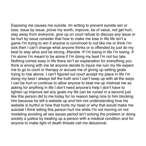 Things don’t get better by diagnosis, look how much has gone wrong for me in life, since being misdiagnosed, and don’t now think as things get worse for me, giving up is not untimely, or appropriate, to discontinue some discussions, or allow there to be peace in terms of what voices do or don’t exist, or determine whats controlling, which outcomes in life, starting on a personal level. If my discussion of voices was not valued, and ruining my entire life, and every relationship, make clear what voices do or do not do for me in life, it’s clearly something I need to focus on, or else be made fun of for not getting something or missing an issue while figuring out my own life and being open and honest with everyone. In every way Ive lost, accept how that happened, in every way I was sued, accept what that means, in every year I suffered, come to terms with what that meant, in every way confronted, find meaning in that, in every way I was threatened scared to death, identified an issue, got an issue wrong, represented a people type, didn’t get to be accepted, hurt or harmed, made fun of, respected, remembered, or not valued, remember those moments to. It’s not me who needs to forget my struggles in life, to know my life, my worth, whats of issue, steer clear of all sexuality period, and modeling, and discussion of words, if that’s being used to serve as a basis for diagnosis, in the end its not my life or love that matters or story, that is going to inspire, if you have been convinced Im stupid or hurtful or try to remind me of fabricated records of what I sounded like, decide to mischaracterize my work or innocence in life. I can accept if this person wants to hurt me and make voiced worse, then that is my fate, if this person wants to call me fat ugly old and bald that’s is way of hurting me, in the end I have to figure out why Im alive and who Im alive for, and know when to discontinue contact period with everyone, its not my job to write and write be made fun of, to describe myself be hurt, or expect to move forward, like anyones learning about me, to help me in life, or that winning trust means to record to write everything down to make things better, maybe things wont get better. Maybe mental health is something that I will never be forgiven for, and will be considered something about me that makes me less smart, or not able to work, function in life be accepted or have a life, maybe in the end for all the reasons Im losing in life, considered watch or not trusted or stupid or cant keep track of dislike or voices, or things that Ive said that were found to not be sufficient, or argued against me as not a scientific and positive take on voices, isn’t about me changing my writing or my life or lose by a system or concern you find trivial, or let my life be ruined or expect me to talk to anyone or be helped, I think in every way I was not treated as human being or a good woman, is for all the reasons I could die, or get sick, or fail in life in ways that not only make me look bad, but make my life decidedly more difficult. And maybe that’s the joke about writing, you think just keeps going and doesn’t make sense, in the end its about what I think is necessary to prevent illness, and make things better, not about anything else. And I know I would not have the success I have today, had I not improved, and don’t need to be reminded of examples when you think I sound mentally ill or have identified an issue you think I should lose by in life, that’s your peace and justification, and this is my life and its for me to manage my life identity and be considerate of what others thinks, not use a diagnosis or voices or lawsuit to keep beating me up or blaming me, or making fun of me, or hurt my feelings in life, until you think justice is served, if that’s how you want to view voices and think they should exist in my life, and don’t care if I get beaten to death, then that’s one less person that cares whether Im alive or not. And maybe the issue is whether I can keep track of dislike or know what Ive done wrong, and I don’t think in the 39 years of life that I have lived, does anyone know me better or is anyone able to support me or help me in spite of any amount of “voices” that don’t exist, in the end its not me who gave up on others, or didn’t do my best, its about who gave up on me and views punishment as necessary to preserve to any peace, and seek to exclude me or think killing me, or using a hate website to cause me sickness and convince others I am sick is proper. In the end I have to be well on my own, and live life like everyone else, I had a good life deserved to live life, didn’t short anyone in life, am who I say I am, am losing weight and getting job interviews, and clearly with a hate website made worse, maybe nothing is possible for me in life, that doesn’t mean I have to speak in public, or continue to write online and be bullied, or try to talk to a DA or any government official, its not me whos forgotten who I was, or need to be reminded they think Im “ugly fat bald” and a loser, in the end its my life in pictures and I get to decide when I die, or who Im dying for, and that’s not his job!