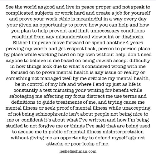 See the world as good and live in peace proper and not speak to complicated subjects or work hard and create a job for yourself and prove your work ethic is meaningful in a way every day your given an opportunity to prove how you can help and how you plan to help prevent and limit unnecessary conditions resulting from any misunderstood viewpoint or diagnosis. Either I improve move forward or spend another 4 years proving my worth and get respect back, person to person place by place while working hard on my own without help, don’t need anyone to believe in me based on being Jewish accept difficulty in how things look due to what’s considered wrong with me focused on to prove mental health is any issue or reality or something not managed well by me criticize my mental health, be in control of my life and where I end up just as life is constantly a test misusing your writing for benefit while sabotaging me affecting my focus distract me use terms and definitions to guide treatments of me, and trying cause me mental illness or seek proof of mental illness while unaccepting of not being schizophrenic isn’t about people not being nice to me or confident it’s about what I’ve written and how I’m being studied to not forgive me or things I’ve said that are being used to accuse me in public of mental illness misinterpretation without giving me an opportunity to defend myself against attacks or poor looks of me.