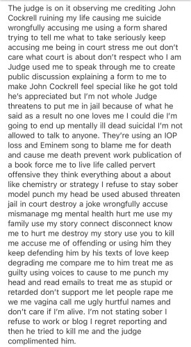 The judge is on it observing me crediting John Cockrell ruining my life causing me suicide wrongfully accusing me using a form shared trying to tell me what to take seriously keep accusing me being in court stress me out don’t care what court is about don’t respect who I am Judge used me to speak through me to create public discussion explaining a form to me to make John Cockrell feel special like he got told he’s appreciated but I’m not whole Judge threatens to put me in jail because of what he said as a result no one loves me I could die I’m going to end up mentally ill dead suicidal I’m not allowed to talk to anyone. They’re using an IOP loss and Eminem song to blame me for death and cause me death prevent work publication of a book force me to live life called pervert offensive they think everything about a about like chemistry or strategy I refuse to stay sober model punch my head be used abused threaten jail in court destroy a joke wrongfully accuse mismanage mg mental health hurt me use my family use my story connect disconnect know me to hurt me destroy my story use you to kill me accuse me of offending or using him they keep defending him by his texts of love keep degrading me compare me to him treat me as guilty using voices to cause to me punch my head and read emails to treat me as stupid or retarded don’t support me let people rape me we me vagina call me ugly hurtful names and don’t care if I’m alive. I’m not stating sober I refuse to work or blog I regret reporting and then he tried to kill me and the judge complimented him.
