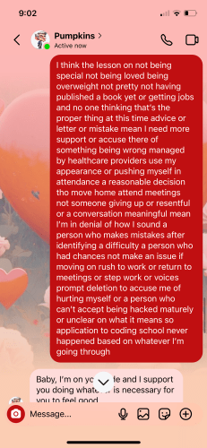 I think the lesson on not being special not being loved being overweight not pretty not having published a book yet or getting jobs and no one thinking that’s the proper thing at this time advice or letter or mistake mean I need more support or accuse there of something being wrong managed by healthcare providers use my appearance or pushing myself in attendance a reasonable decision tho move home attend meetings not someone giving up or resentful or a conversation meaningful mean I’m in denial of how I sound a person who makes mistakes after identifying a difficulty a person who had chances not make an issue if moving on rush to work or return to meetings or step work or voices prompt deletion to accuse me of hurting myself or a person who can’t accept being hacked maturely or unclear on what it means so application to coding school never happened based on whatever I’m going through.